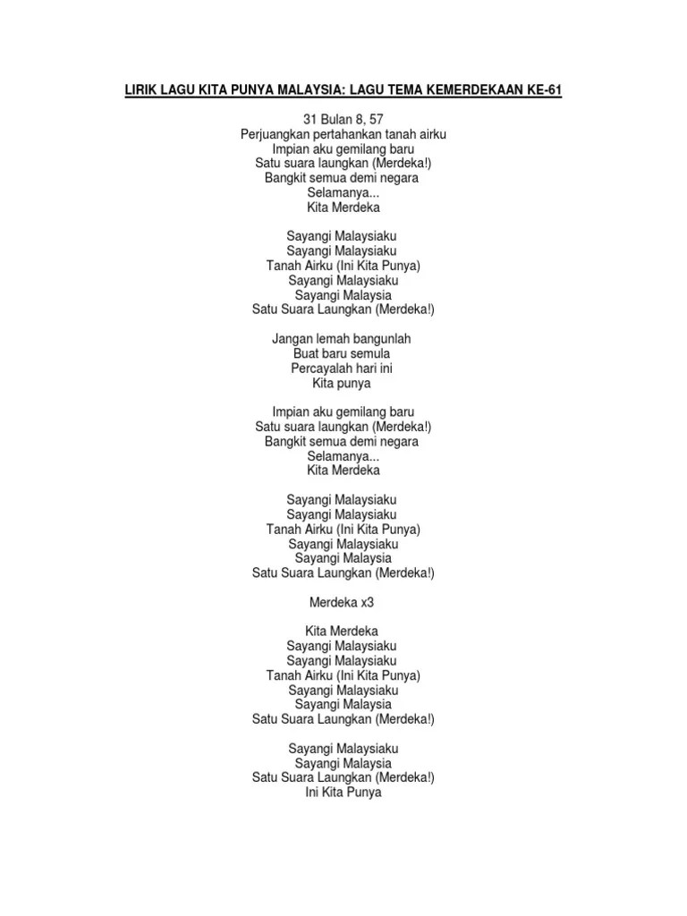 Lirik Lagu Kita Punya Malaysia from imgv2-1-f.scribdassets.com Lagu malaysia bersih penyanyi : Lirik lagu hari kebangsaan 'sayangi malaysiaku: Lirik lagu malaysia bersih harapan semua moga kita berjaya bagai negara yang kekal merdeka. Lagu 'malaysia bersih' dicadang untuk dinyanyikan dalam acara tertentu dan program rasmi kerajaan, kata tun dr mahathir mohamad. Harapan semua moga kita berjaya. For your search query lirik lagu merdeka 2019 tema malaysia bersih mp3 we have found 1000000 songs matching your query but showing only top 10. Asal budaya kita budi pekerti indah amanah jujur amalan kita. Kita punya malaysia bunkface lagu tema hari kebangsaan malaysia ke 61.